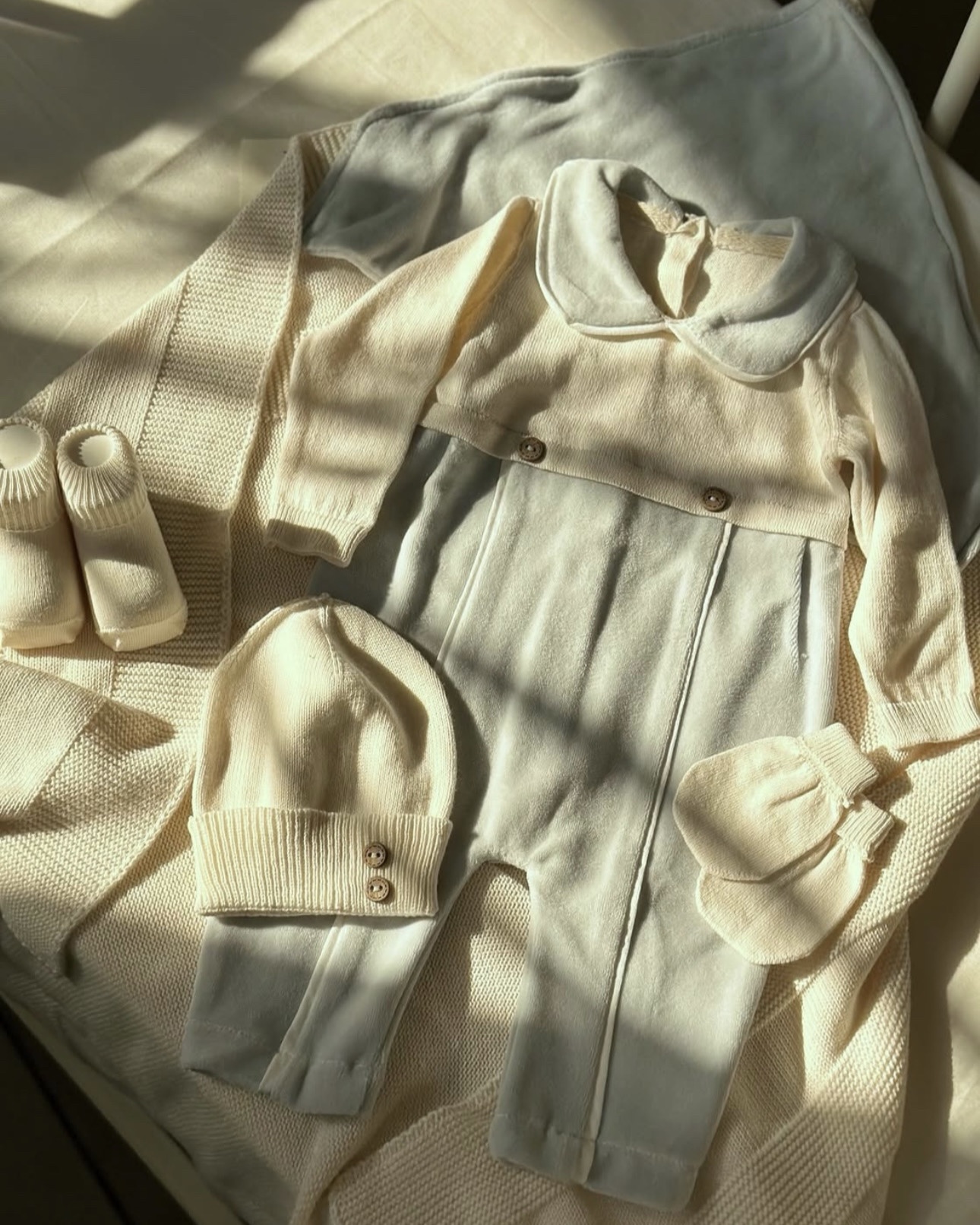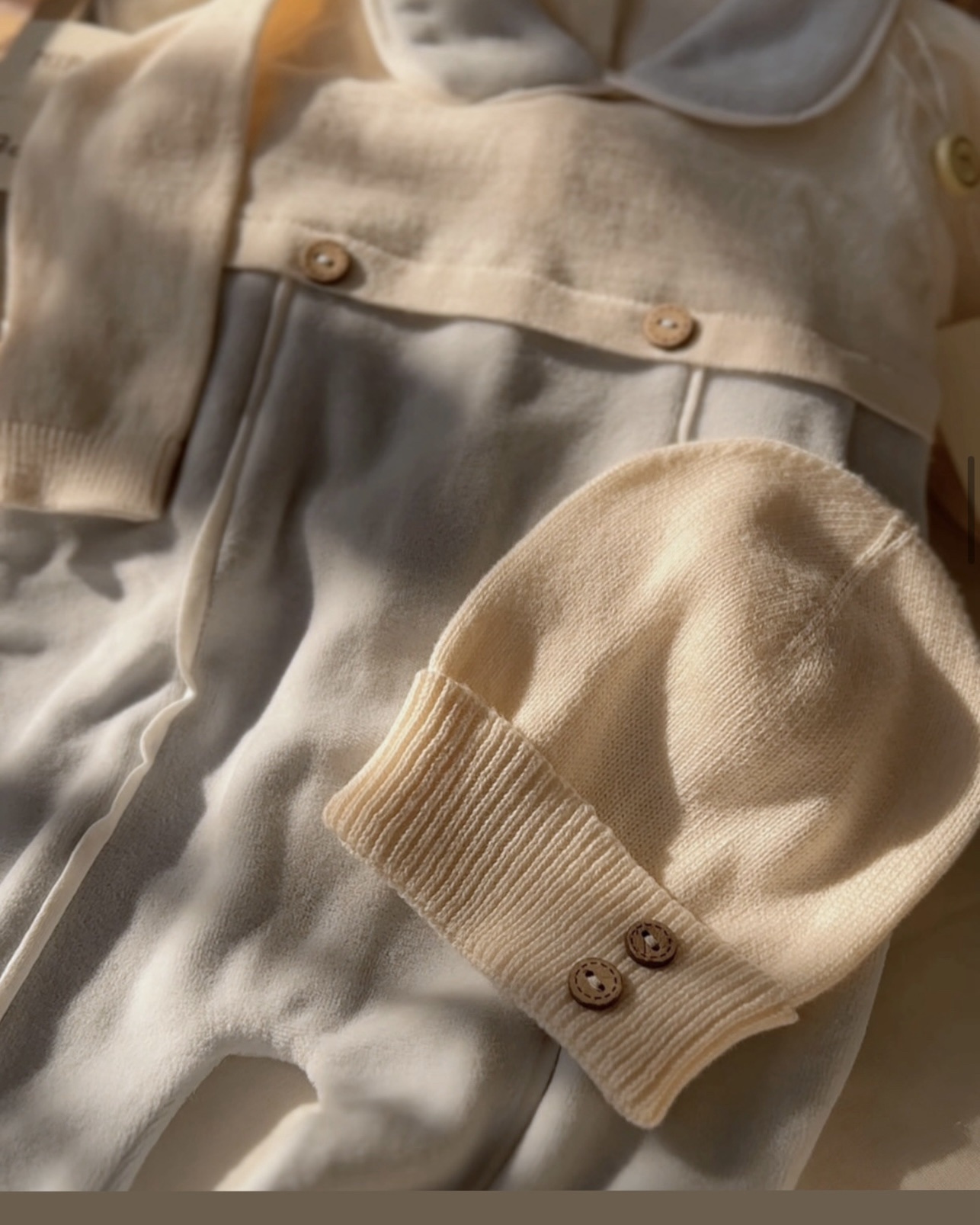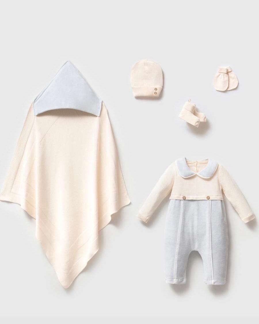 סט תינוקות יוקרתי בצבעי שמנת ותכלת, כולל אוברול, כובע, כפפות, גרביים ושמיכה עם כובע – מושלם ליציאה מבית החולים או לאירוע מיוחד