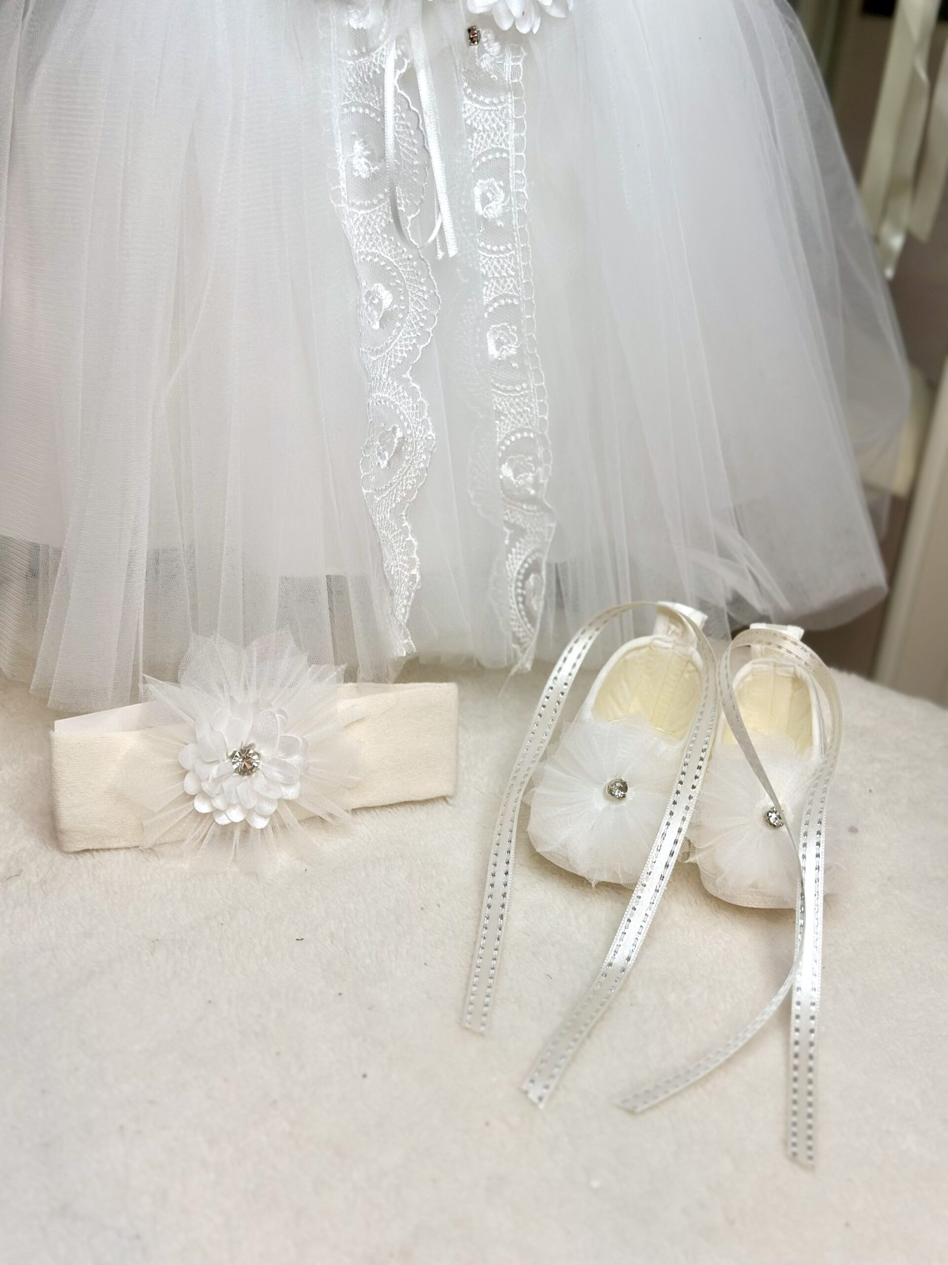 הסט מגיע עם סרט ראש תואם ונעלי בד בעיטור פרח טול, ליצירת מראה מושלם לאירועים מיוחדים.