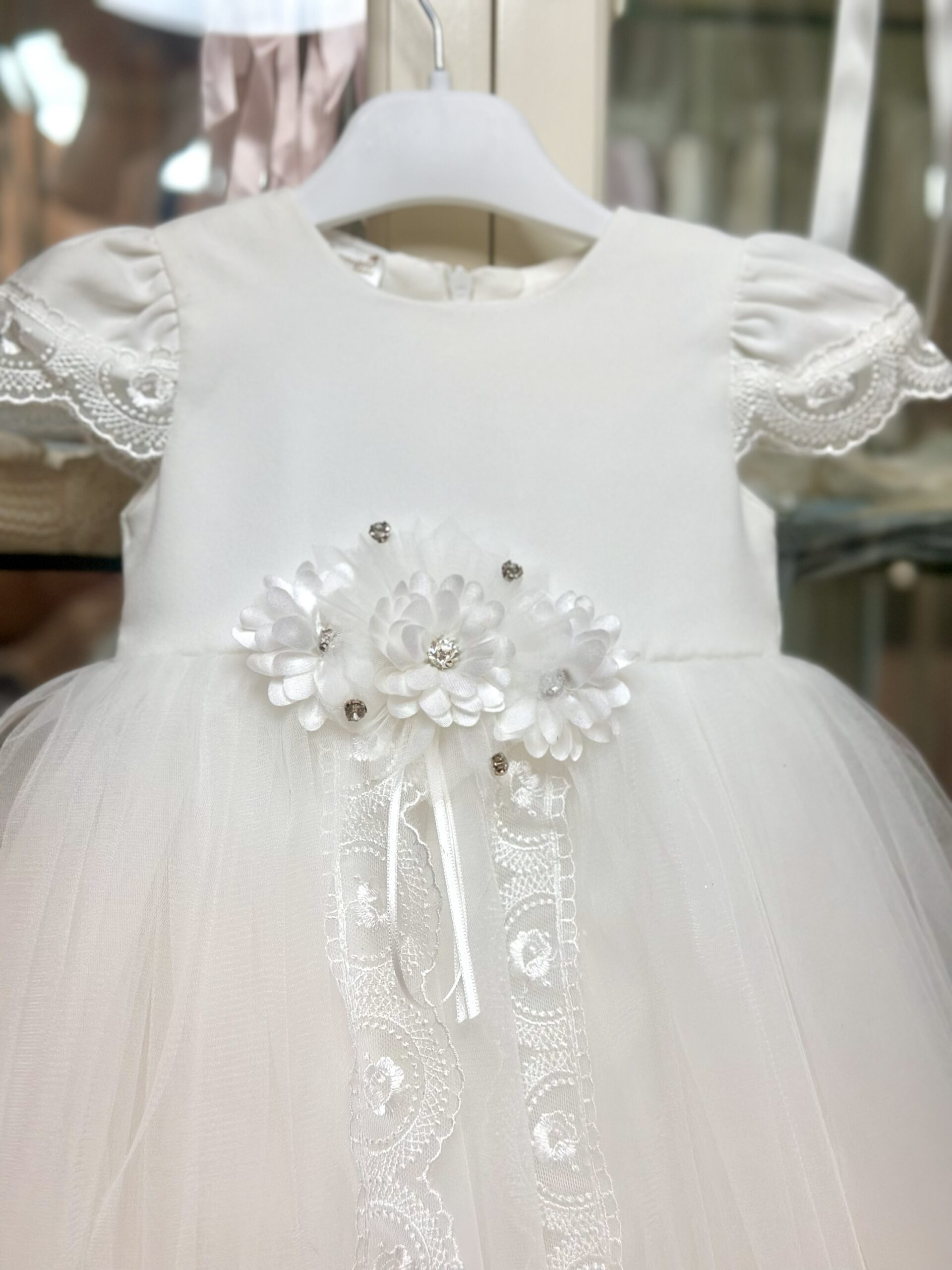 סט חגיגי ומלא אלגנטיות הכולל שמלת טול לבנה קלאסית עם שרוולים תפוחים מעוטרים בתחרה עדינה. החלק העליון מעוטר בפרחי בד לבנים עם נגיעות של אבני חן נוצצות, וחצאית הטול המלאה מוסיפה נפח ורכות.