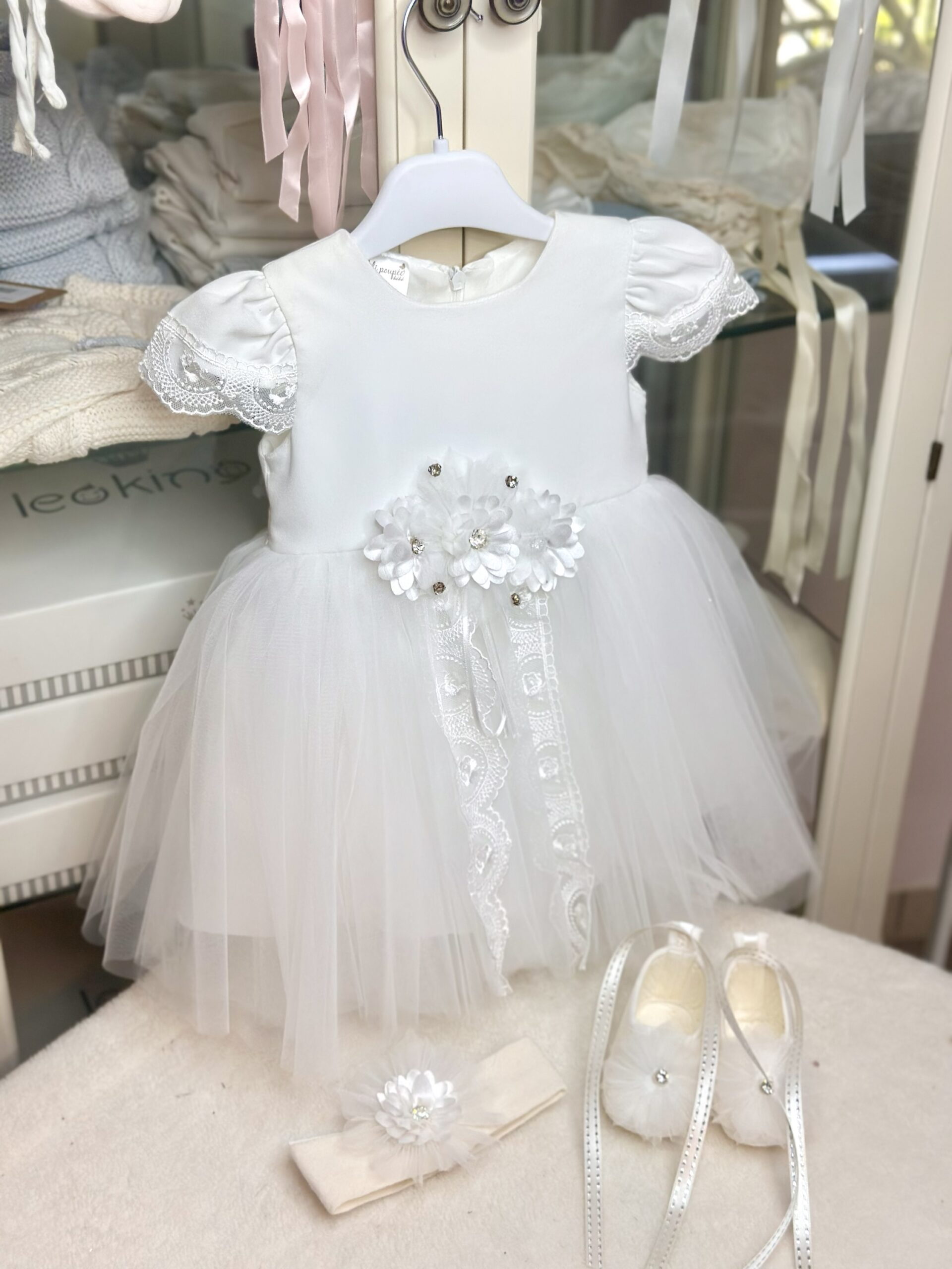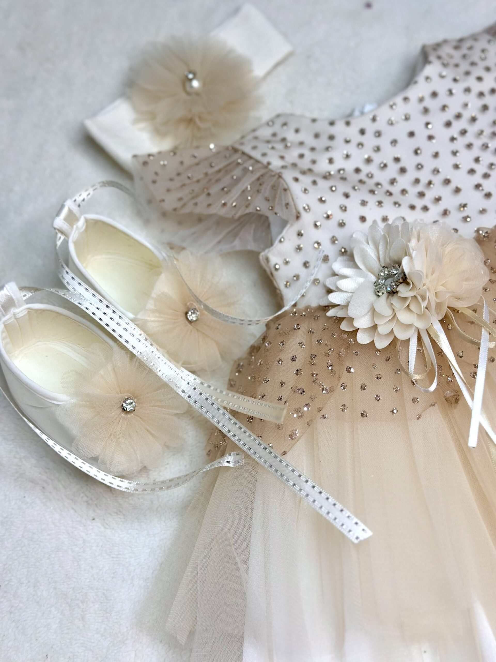השמלה מגיעה יחד עם נעלי בד תואמות בעיטור פרח טול וסרט ראש מקסים ליצירת מראה מושלם.