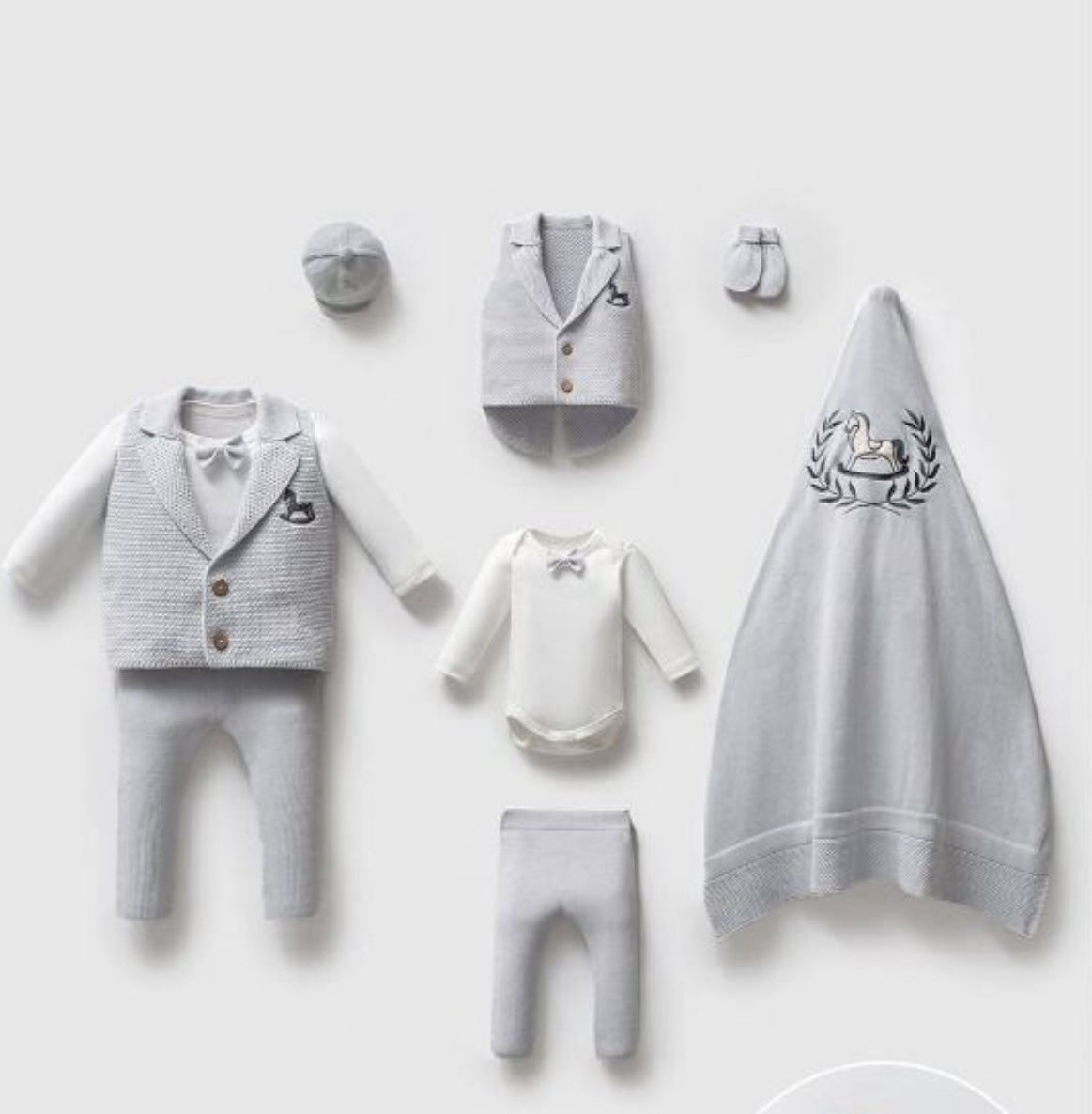 סט תינוקות אלגנטי מידה 0-3 צבע כחול לילך , כולל אוברול סרוג עם וסט ופפיון, כובע תואם, כפפות ושמיכה עדינה עם הכיתוב עיצוב נקי וקלאסי המשלב נוחות ורכות, מושלם לניו־בורן, לצילומים ולאירועים מיוחדים