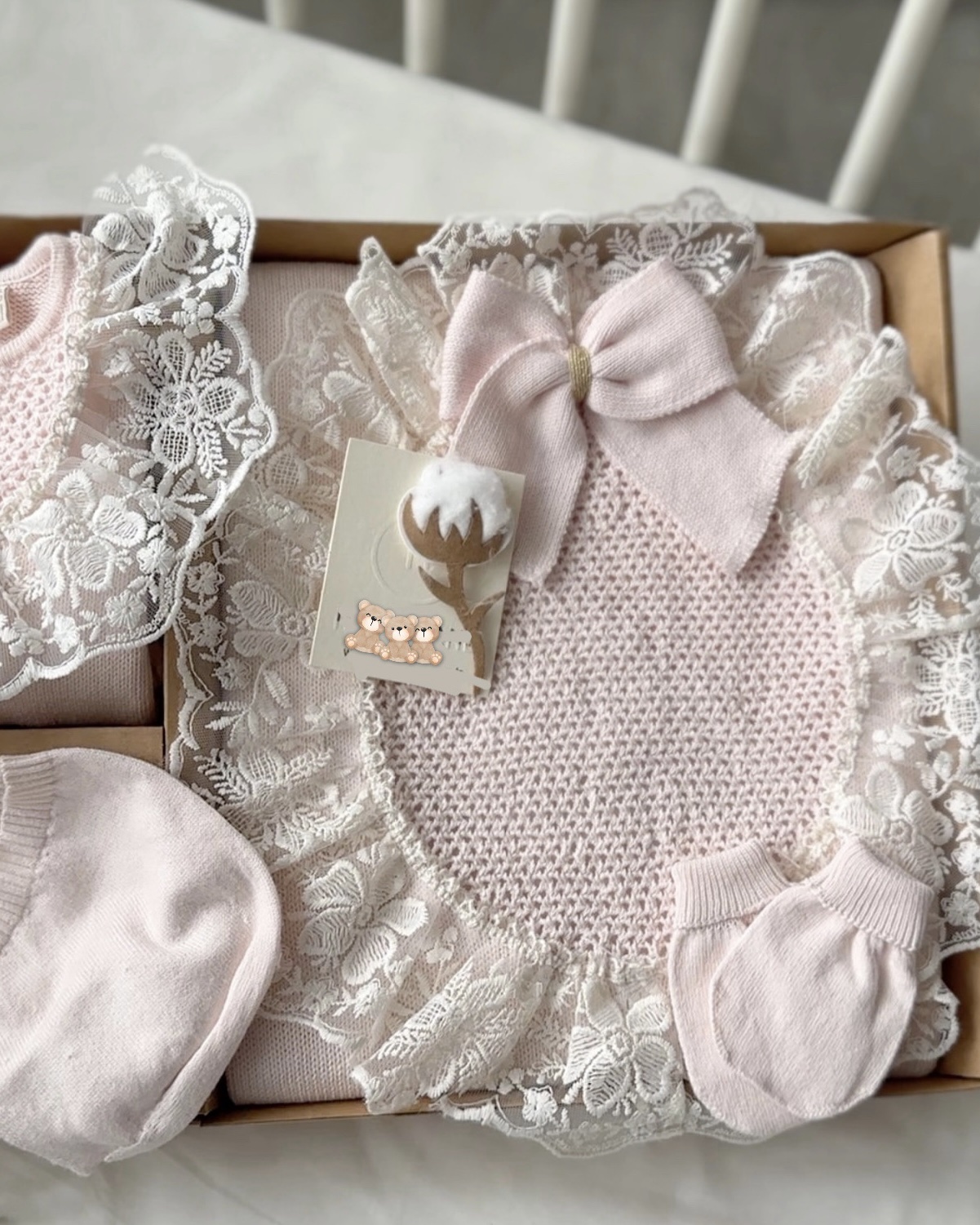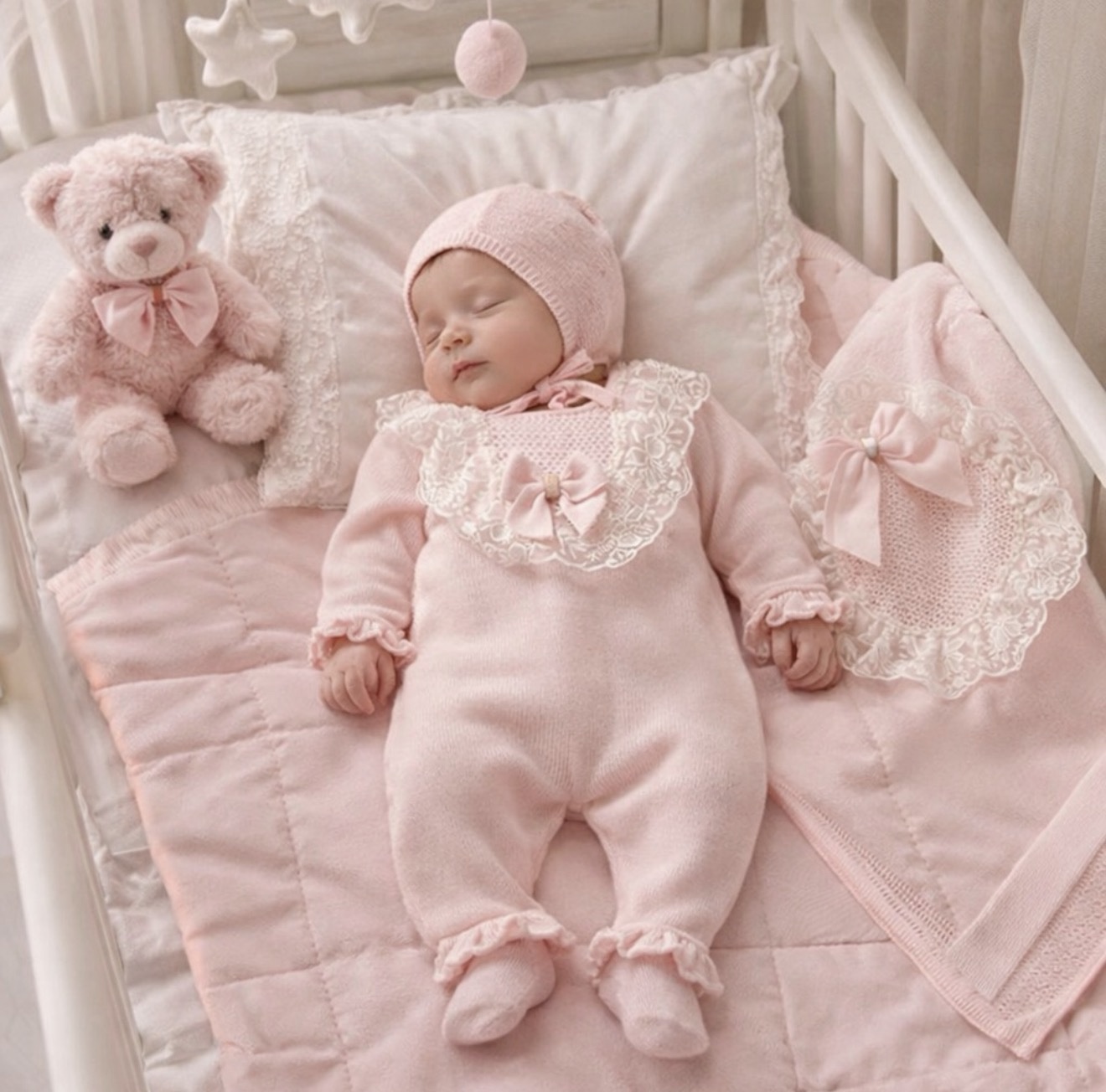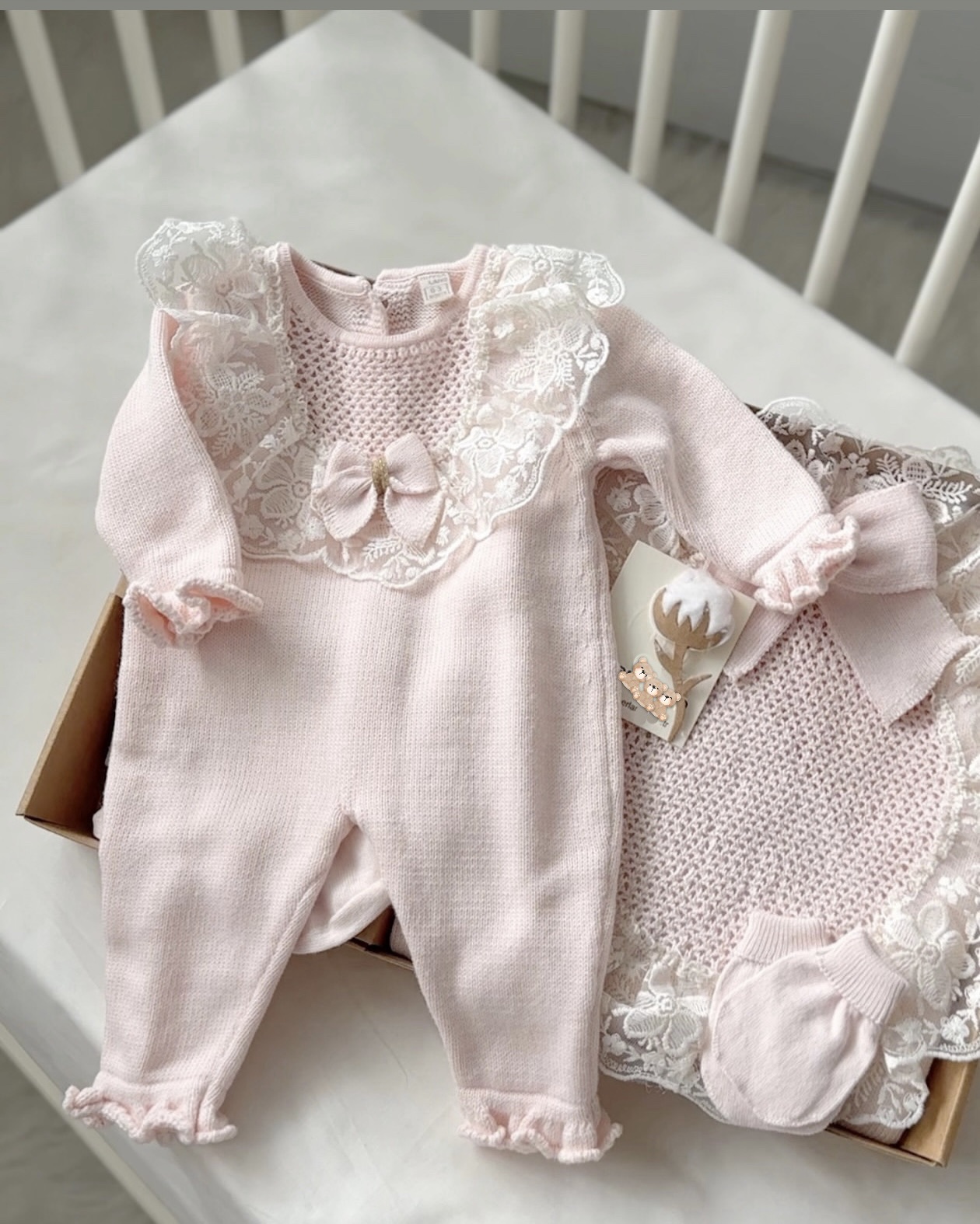 סט בייבי מהמם בגוון ורוד פסטל הכולל: אוברול סרוג עם תחרה עדינה וקשירה, כובע תואם, כפפות, גרביים ושמיכת תחרה יוקרתית. עיצוב אלגנטי ורך, מושלם כמתנת לידה או לשימוש יומיומי.